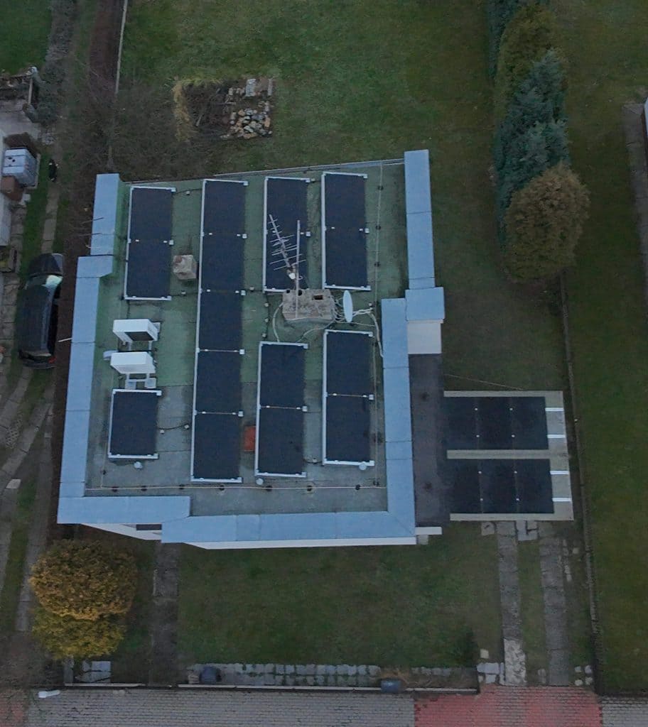 Zvolili jsme výkonné panely Aiko 450 Wp v počtu 22 ks, které jsou uloženy v optimalizovaném sklonu pro zimní měsíce. Celkový výkon systému dosahuje 9,9 kWp a je řízen 1× třífázovým střídačem Solax 10.0D. Pro ukládání přebytků slouží baterie s kapacitou 11,6 kWh.